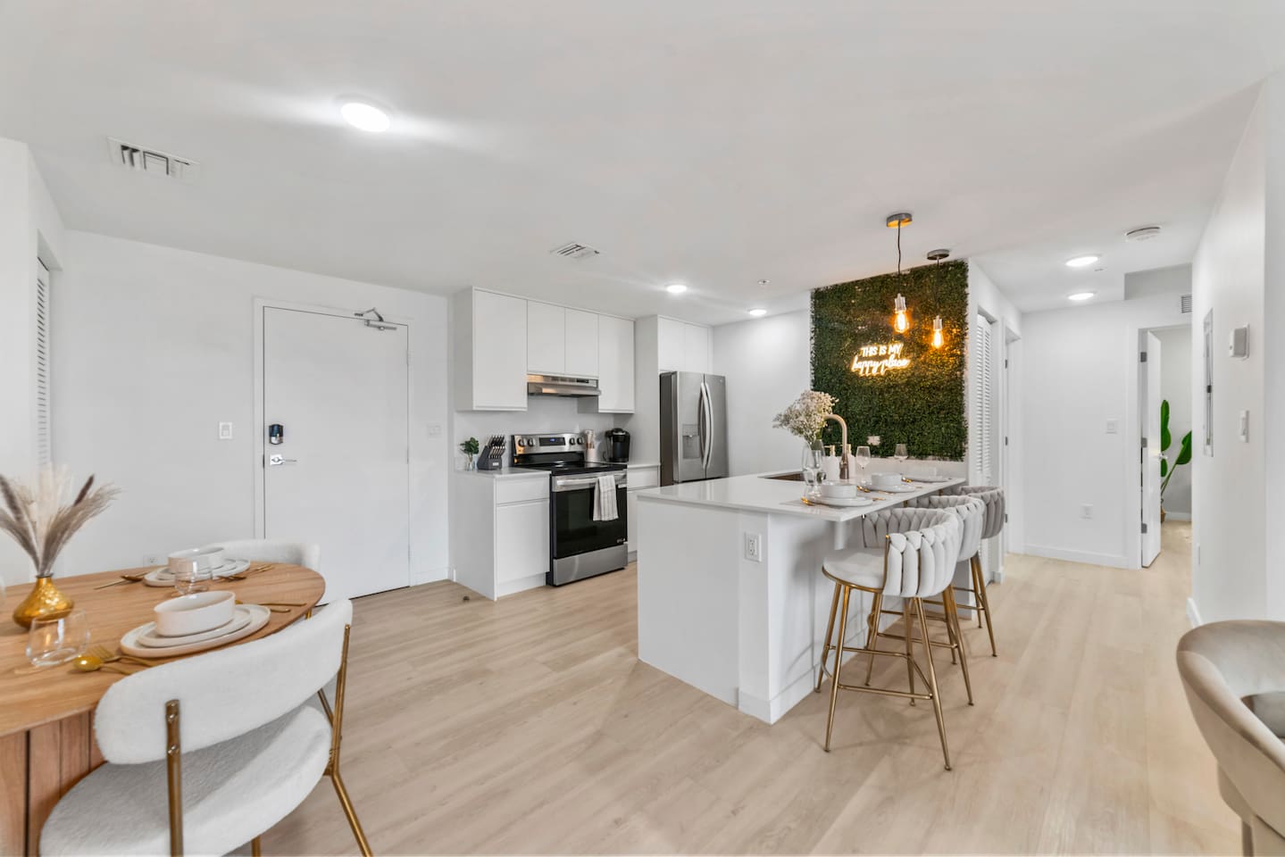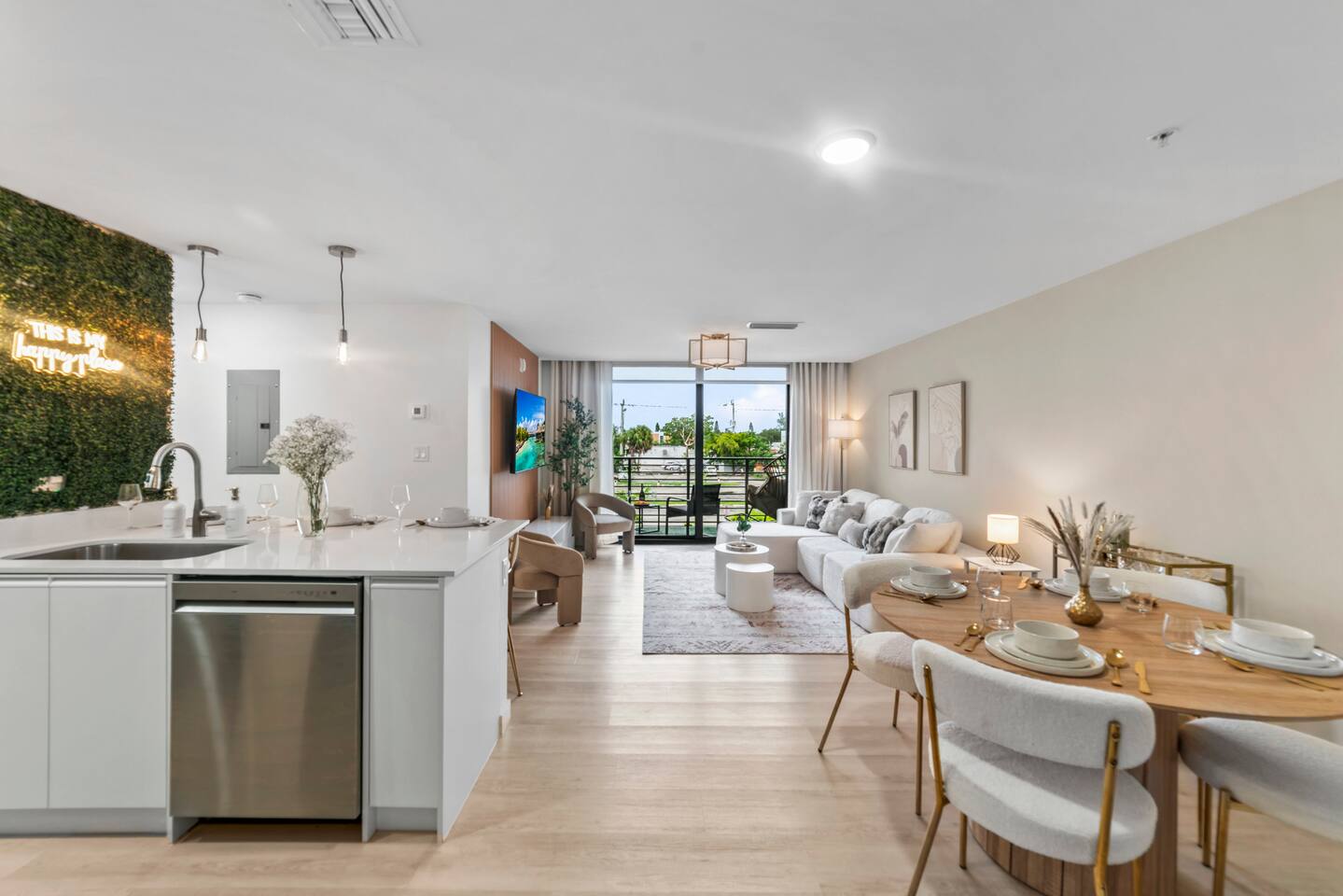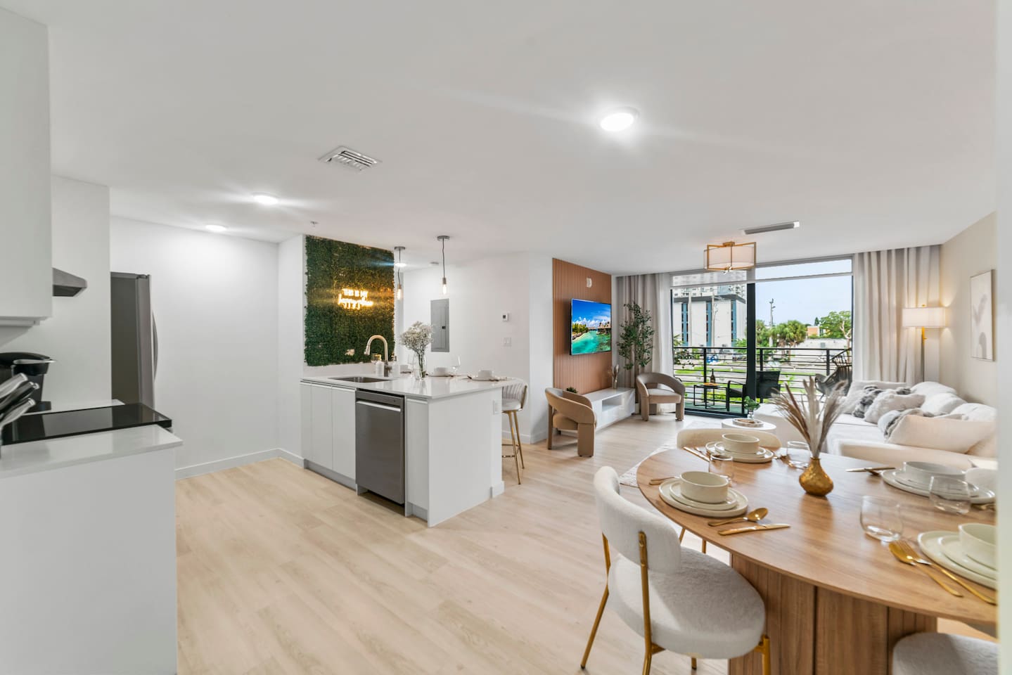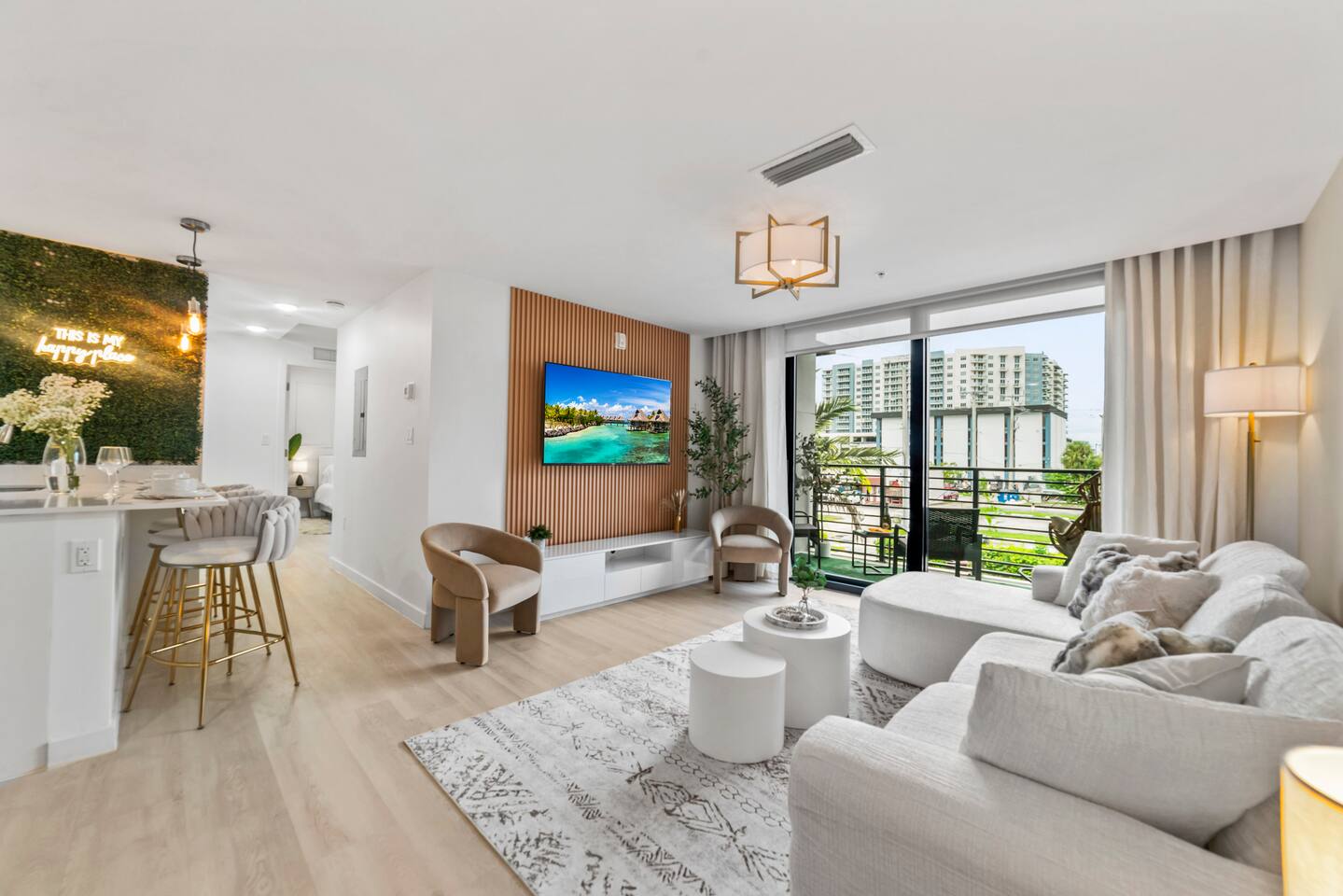Welcome to Soft Sands 🌟 Your private escape just minutes from Hollywood Beach. Step into Soft Sands - a serene blend of modern luxury and coastal elegance. This refined 2-bedroom, 2-bathroom retreat is thoughtfully designed to offer a peaceful escape—perfect for couples, families, or solo travelers who appreciate style, comfort, and tranquility. Unwind by the rooftop pool with panoramic city views, or relax in your beautifully curated suite, where every detail has been chosen to create an atmosphere of calm sophistication. Conveniently located just 15 minutes from Fort Lauderdale Airport and 25 minutes from Miami International Airport, this getaway offers both ease and exclusivity. 🌟Your Private Escape 🌟 Living Space 🌟 An elegant living room that offers a refined yet inviting atmosphere, perfect for unwinding after a day in the sun. Soft textures, modern accents, and thoughtfully curated décor create an ambiance of effortless luxury. Kickback in front of our 58” smart TV! Bedrooms 🛌 Indulge in comfort within two KING bedrooms, each appointed with plush bedding, and elevated design details to ensure a truly restful night’s sleep. Bathrooms 🚿 Two spa-inspired bathrooms evoke a boutique hotel experience, featuring spacious walk-in showers, premium toiletries, and fresh, fluffy towels that add a touch of indulgence to your daily routine. Kitchen 🧑🍳 A gourmet kitchen awaits you — fully equipped with high-end appliances, sleek finishes, and everything you need to craft a perfect meal or enjoy your morning espresso in style. Internet 🛜 Stay seamlessly connected with high-speed Wi-Fi and enjoy your favorite shows on the smart TV, all while surrounded by tranquil comfort thanks to central air conditioning throughout. Washer and Dryer 🧼 For extended stays, the convenience of in-suite laundry ensures every detail of your visit feels effortless and refined Private Balcony ☀️ Enjoy your morning coffee on a private balcony. Relax in a cozy egg chair while watching the sun go down. 🌟 Building Amenities 🌟 Rooftop Pool & Sun Terrace ⭐️ ☀️ Take in breathtaking panoramic views while cooling off with a refreshing dip. Whether you’re enjoying a quiet morning swim or sunset cocktails, the rooftop terrace offers the perfect backdrop for relaxation and indulgence. Fitness Center 🏋️♂️ Maintain your wellness routine in style with access to a fully equipped gym featuring modern equipment and a clean, airy atmosphere. Private Parking 🚗 Enjoy two secure, private parking spaces with automatic access—ensuring a smooth and seamless arrival and departure experience. Nearby Attractions 🌆 🏖️ 🎶 ⭐️ Hollywood Beach & Broadwalk – 7 minutes Explore a lively stretch of oceanfront dining, boutique shopping, and golden sands—ideal for both leisurely strolls and vibrant beach days. ⭐️ Hallandale Beach – 10 minutes Escape the crowds at this serene coastal gem, known for its calm waters and relaxed atmosphere. ⭐️ Aventura Mall – 15 minutes Discover luxury shopping, gourmet dining, and world-class entertainment all in one sophisticated destination. ⭐️ Seminole Hard Rock Hotel & Casino Immerse yourself in upscale nightlife, live performances, and exquisite dining experiences at one of Florida’s premier entertainment venues. ⭐️ Miami & Fort Lauderdale Effortlessly explore two of Florida’s most iconic cities—each offering its own unique blend of culture, cuisine, and coastal charm